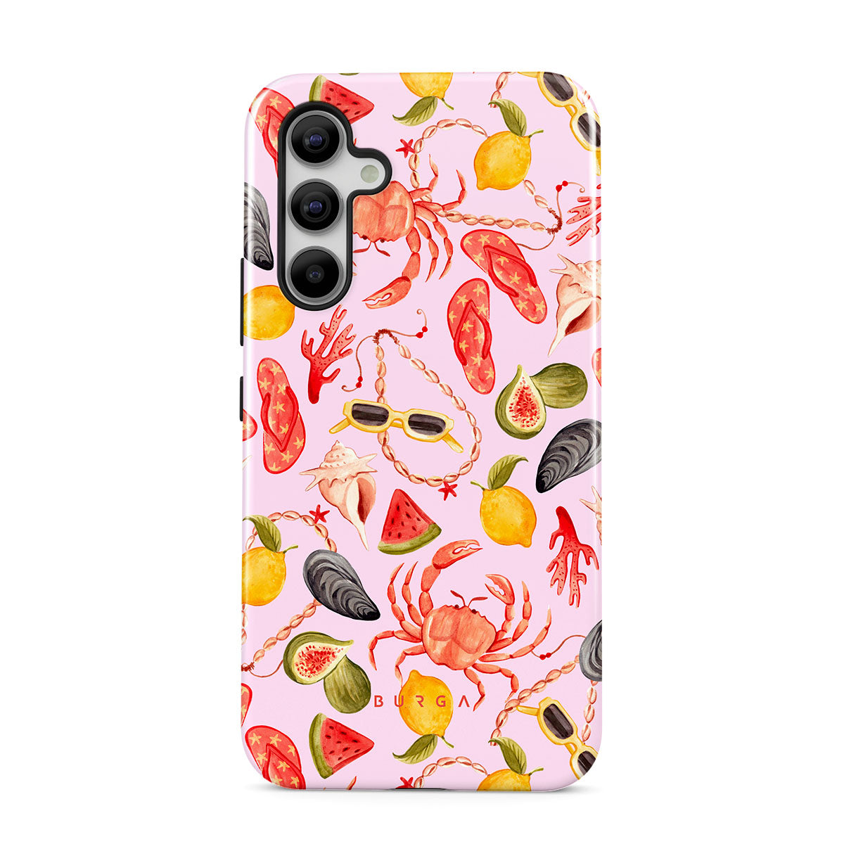 Cechy projektu: arbuz, okulary przeciwsłoneczne, owoce morza, krab, japonki, ostrygi, cytryna, żywe kolory, tropikalny motyw