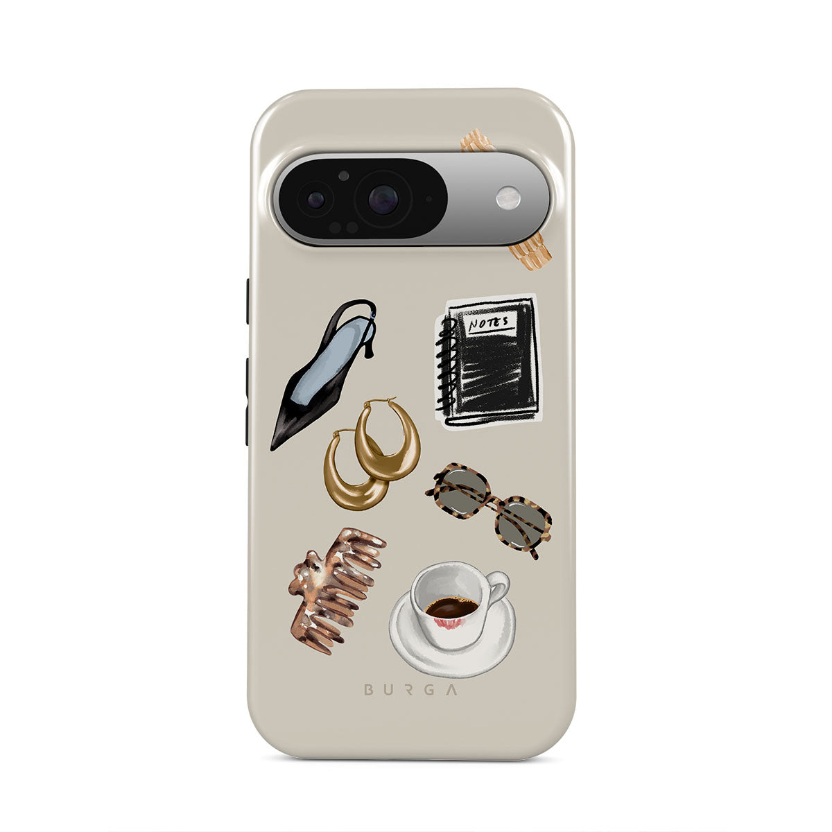 Główne elementy projektu: czarną szpilkę, złote kolczyki-koła, czarny notatnik, kubek kawy, okulary w panterkę, brązową gumkę do włosów, retro złoty zegarek.