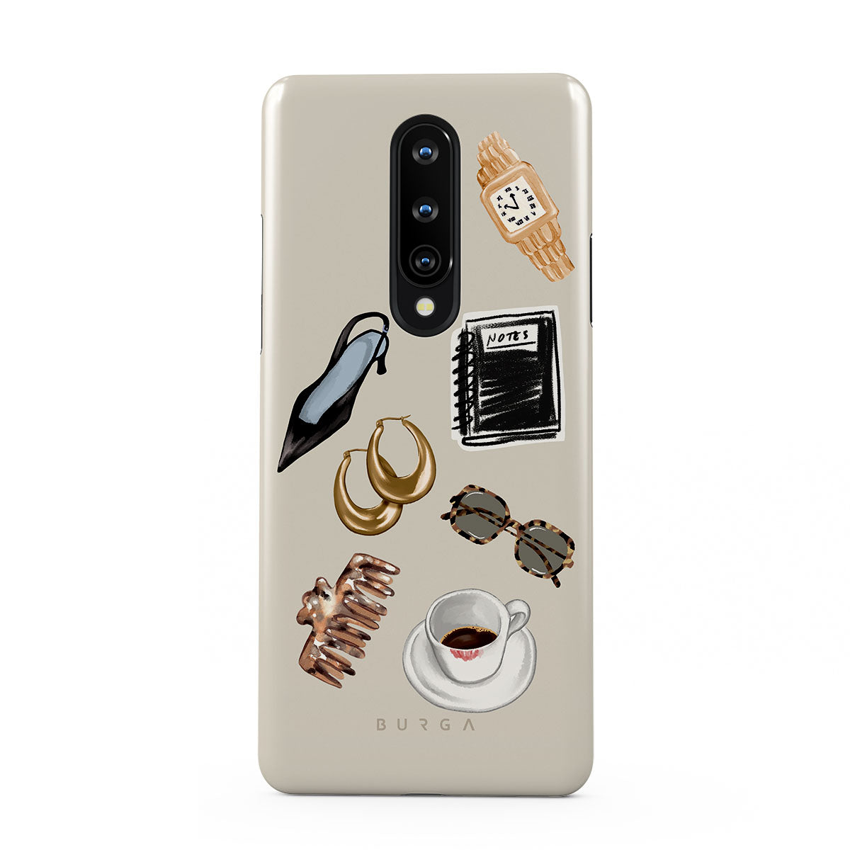 Główne elementy projektu: czarną szpilkę, złote kolczyki-koła, czarny notatnik, kubek kawy, okulary w panterkę, brązową gumkę do włosów, retro złoty zegarek.