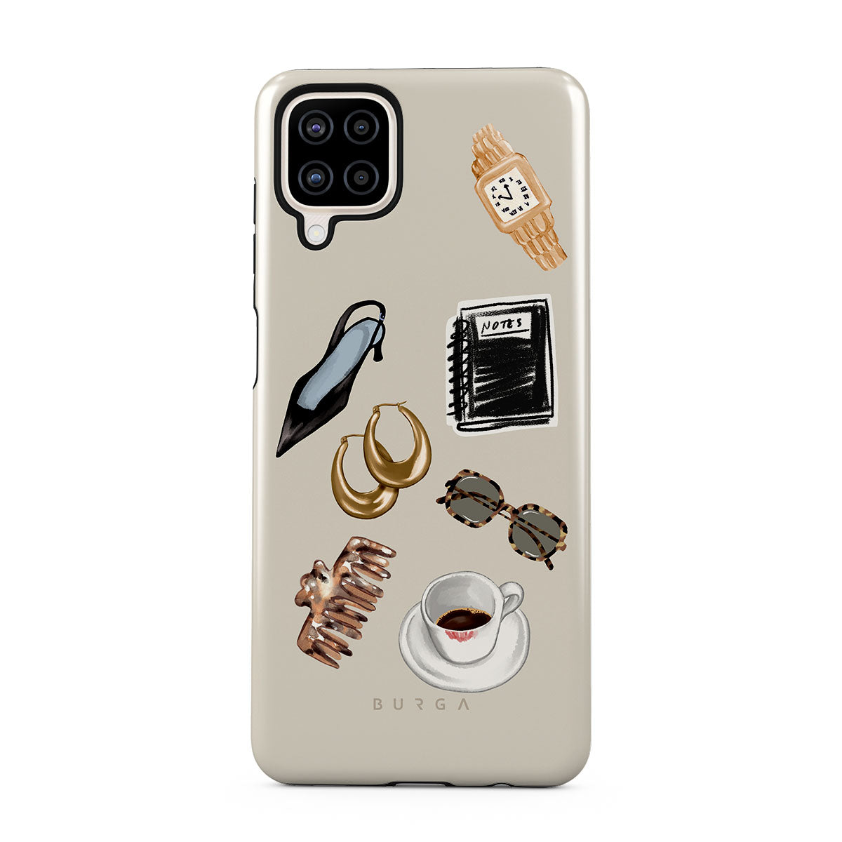 Główne elementy projektu: czarną szpilkę, złote kolczyki-koła, czarny notatnik, kubek kawy, okulary w panterkę, brązową gumkę do włosów, retro złoty zegarek.