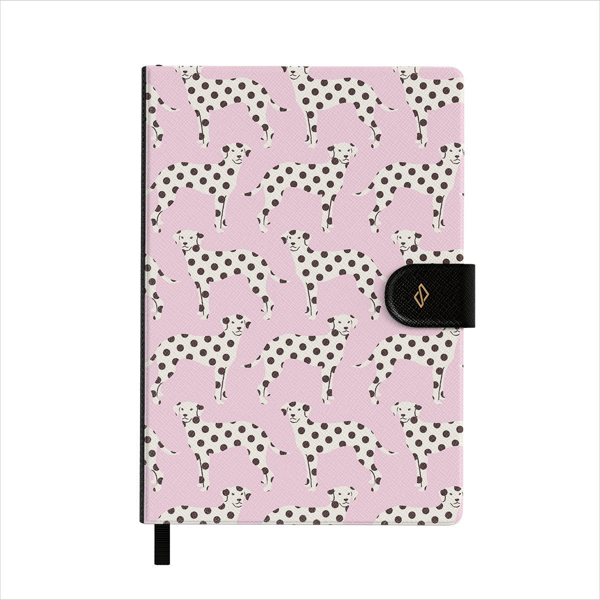 Główne elementy projektu: dalmatyńczyki na jasnoróżowym tle, psy.