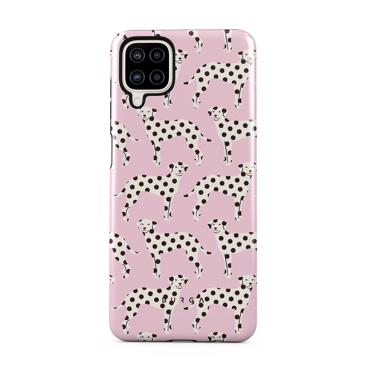 Główne elementy projektu: dalmatyńczyki na jasnoróżowym tle, psy.