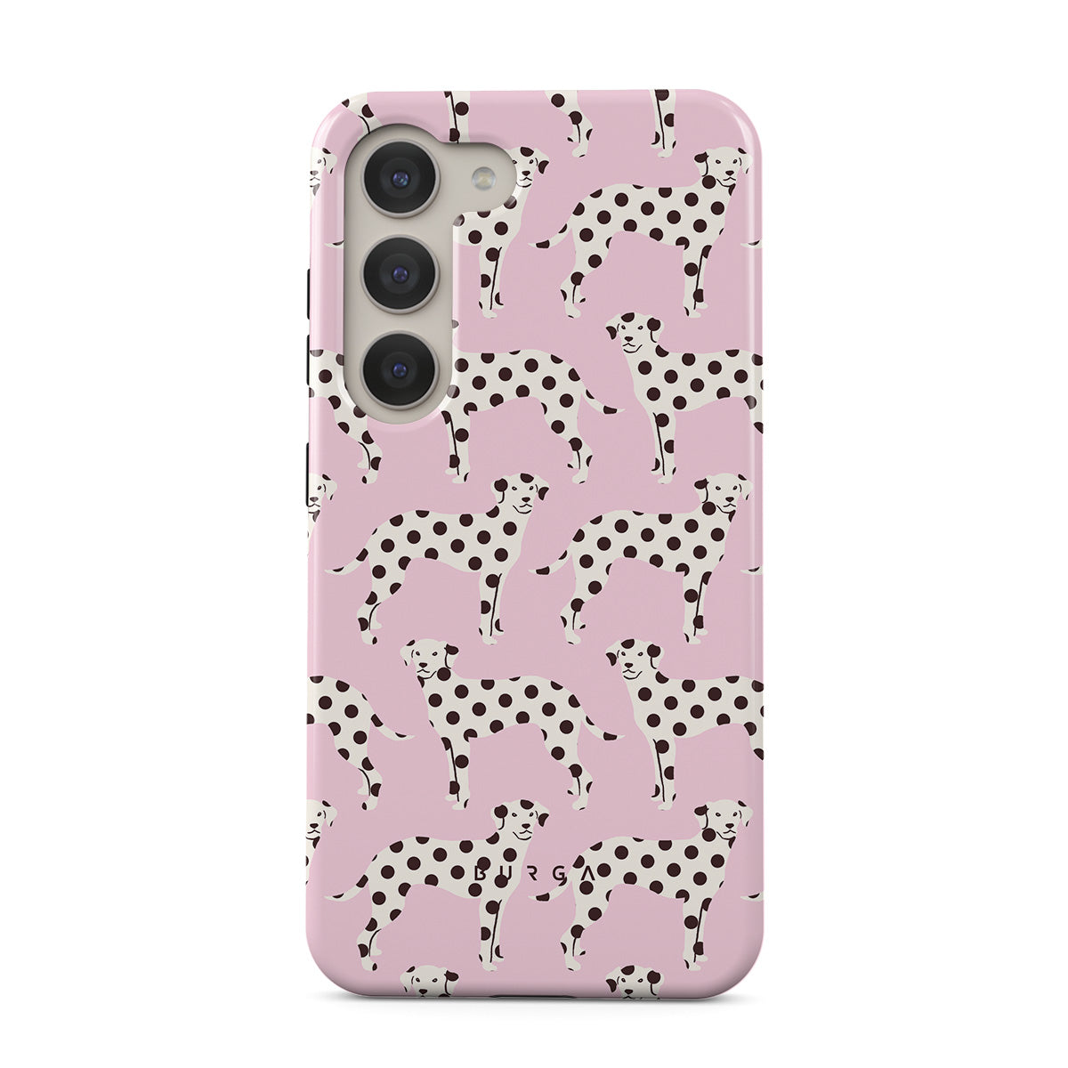 Główne elementy projektu: dalmatyńczyki na jasnoróżowym tle, psy.