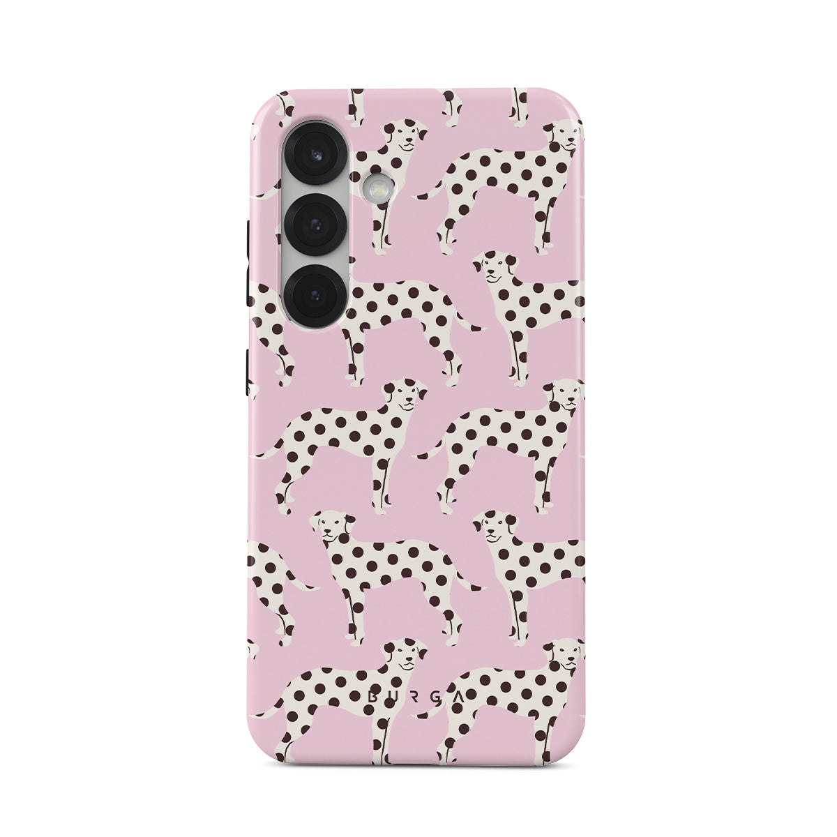 Główne elementy projektu: dalmatyńczyki na jasnoróżowym tle, psy.