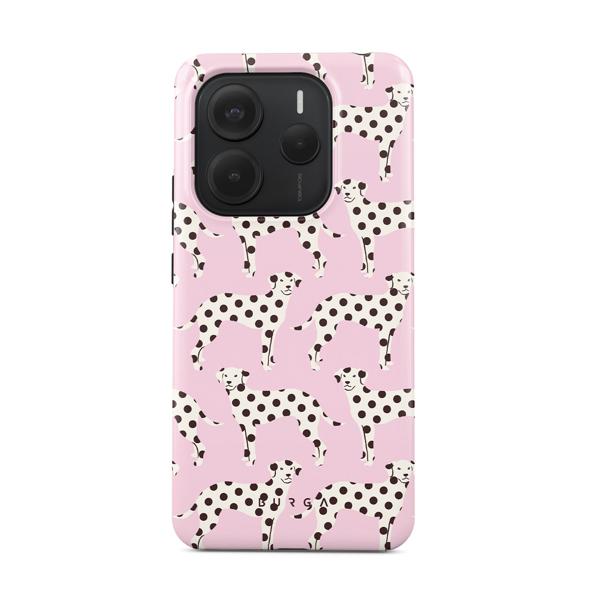 Główne elementy projektu: dalmatyńczyki na jasnoróżowym tle, psy.