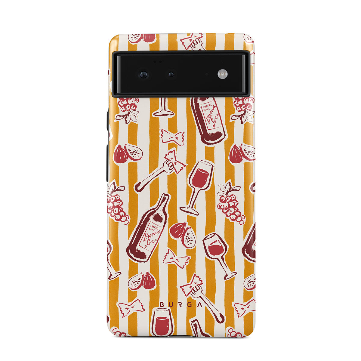 Główne elementy projektu: owoce, figi, winogrona, widelce, makaron, wino, kieliszek, paski.