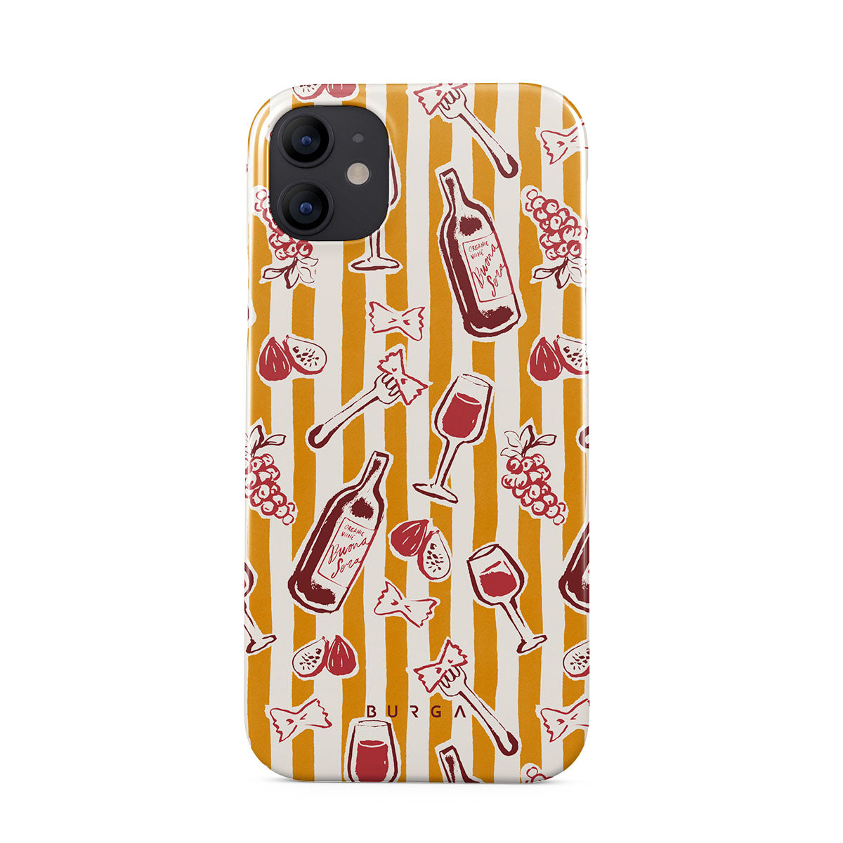Główne elementy projektu: owoce, figi, winogrona, widelce, makaron, wino, kieliszek, paski.