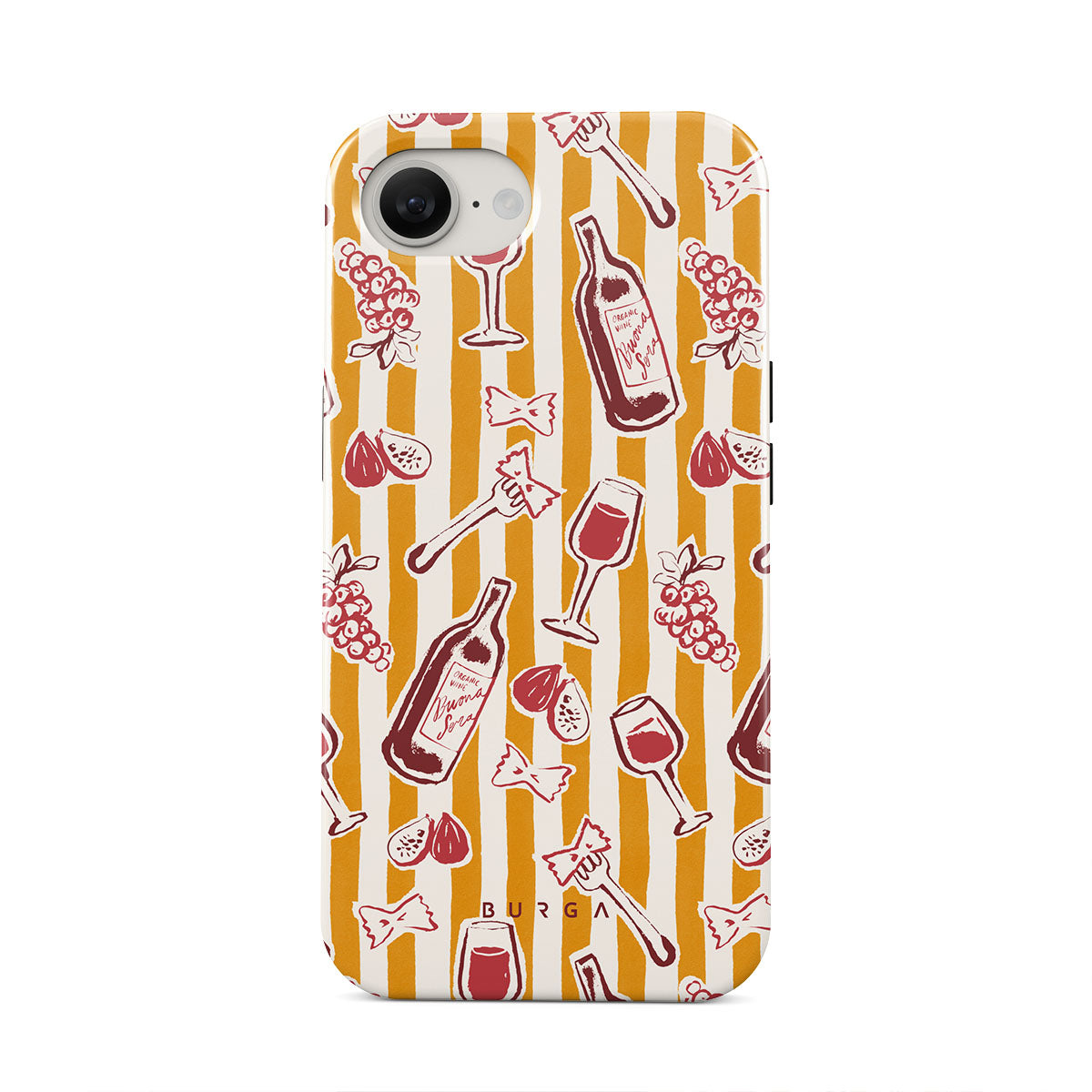 Główne elementy projektu: owoce, figi, winogrona, widelce, makaron, wino, kieliszek, paski.