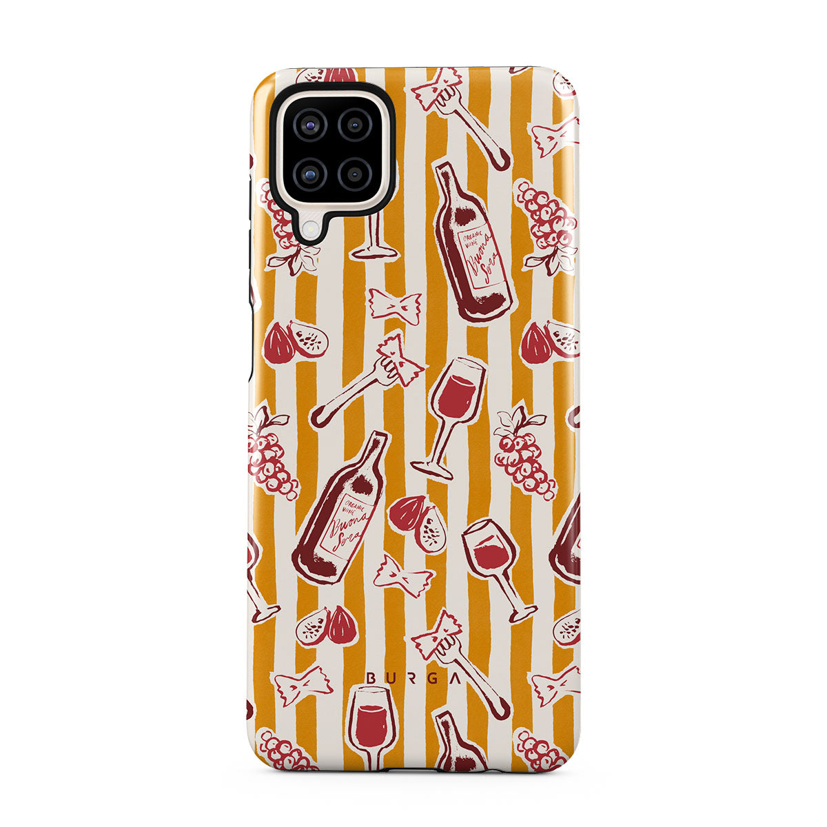 Główne elementy projektu: owoce, figi, winogrona, widelce, makaron, wino, kieliszek, paski.
