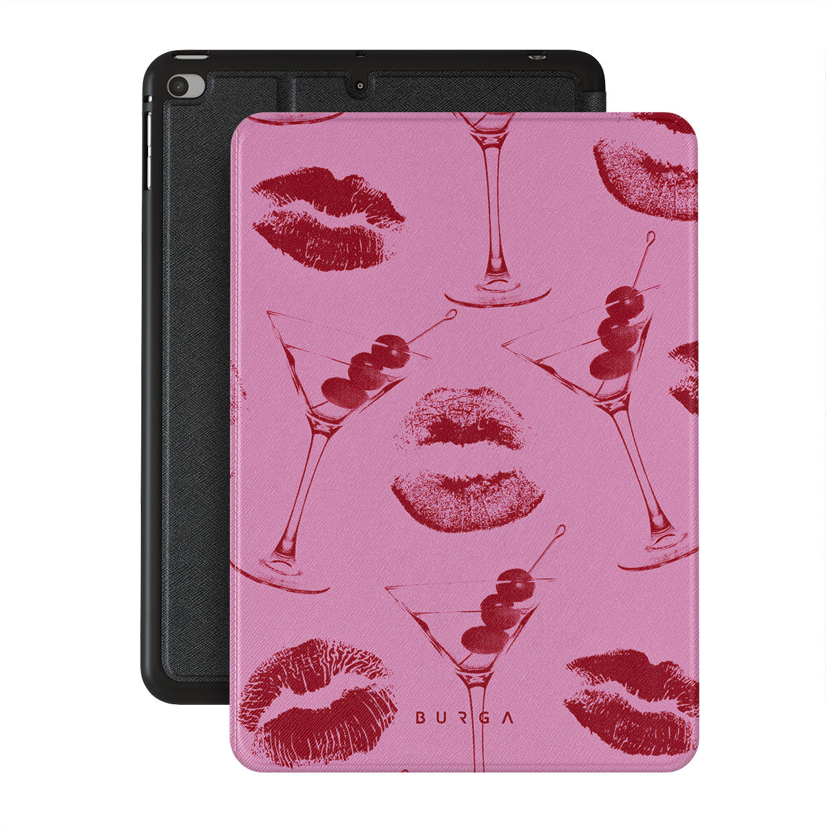 Główne elementy projektu: czerwone usta, pocałunki, kieliszki koktajlowe, martini.