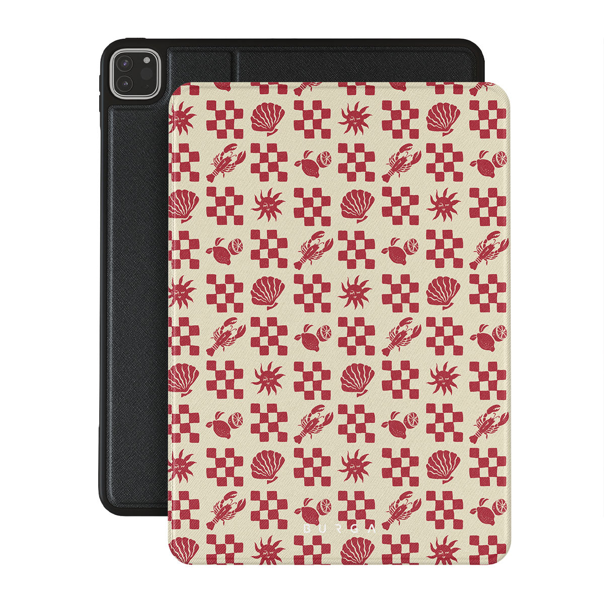 Główne elementy projektu: Czerwone kraciaste wzory, muszle, homar, włoskie motywy.