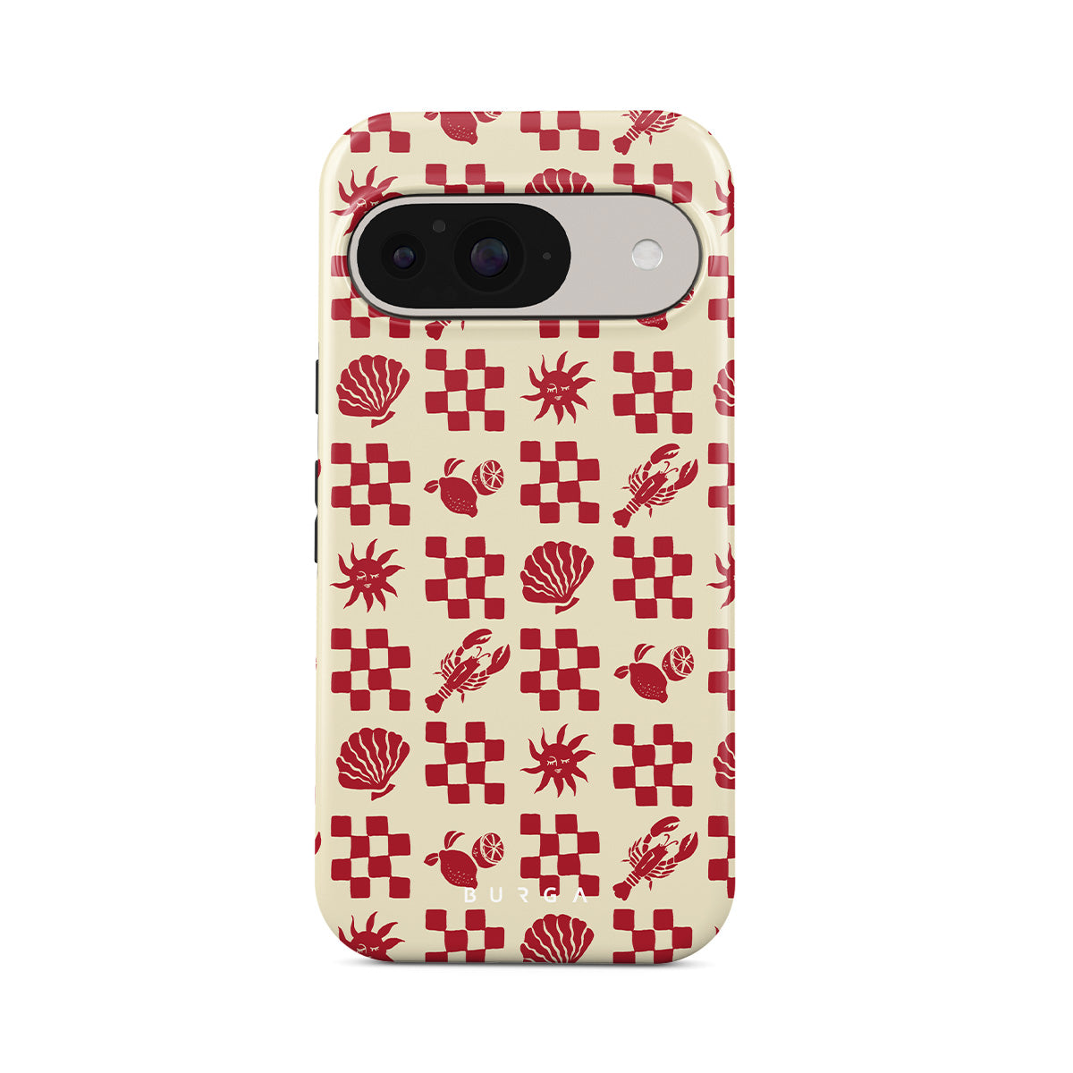 Główne elementy projektu: Czerwone kraciaste wzory, muszle, homar, włoskie motywy.
