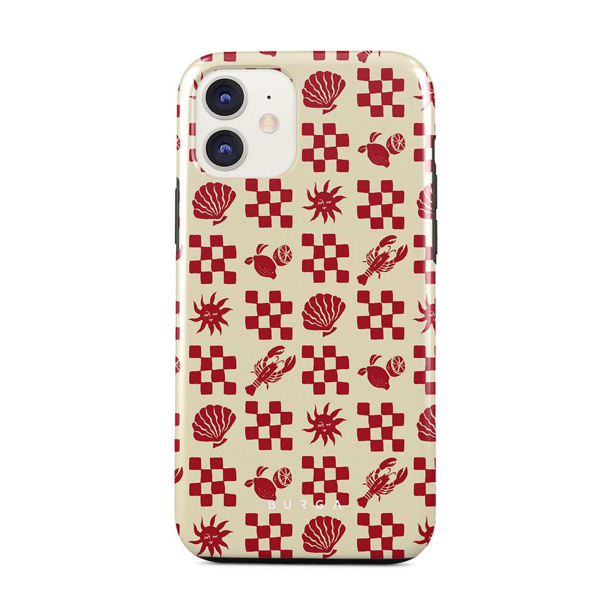 Główne elementy projektu: Czerwone kraciaste wzory, muszle, homar, włoskie motywy.