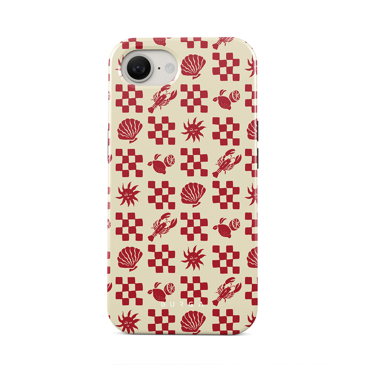 Główne elementy projektu: Czerwone kraciaste wzory, muszle, homar, włoskie motywy.