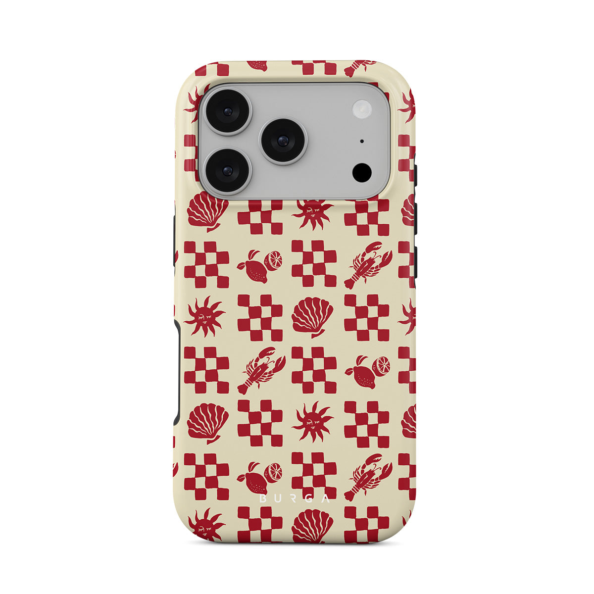 Główne elementy projektu: Czerwone kraciaste wzory, muszle, homar, włoskie motywy.