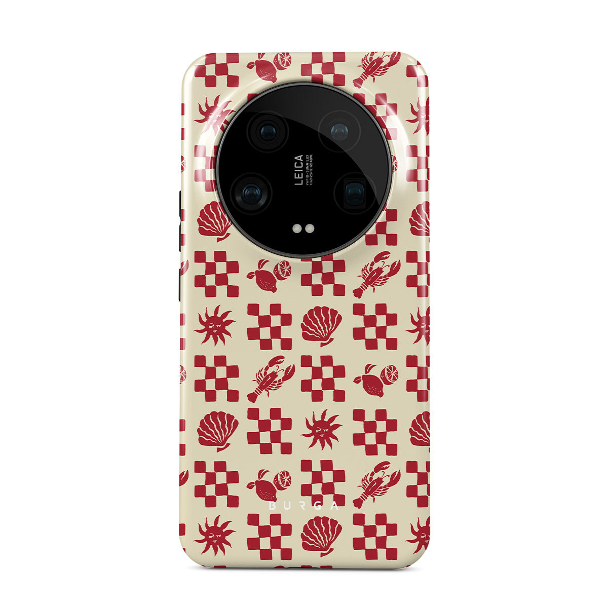 Główne elementy projektu: Czerwone kraciaste wzory, muszle, homar, włoskie motywy.