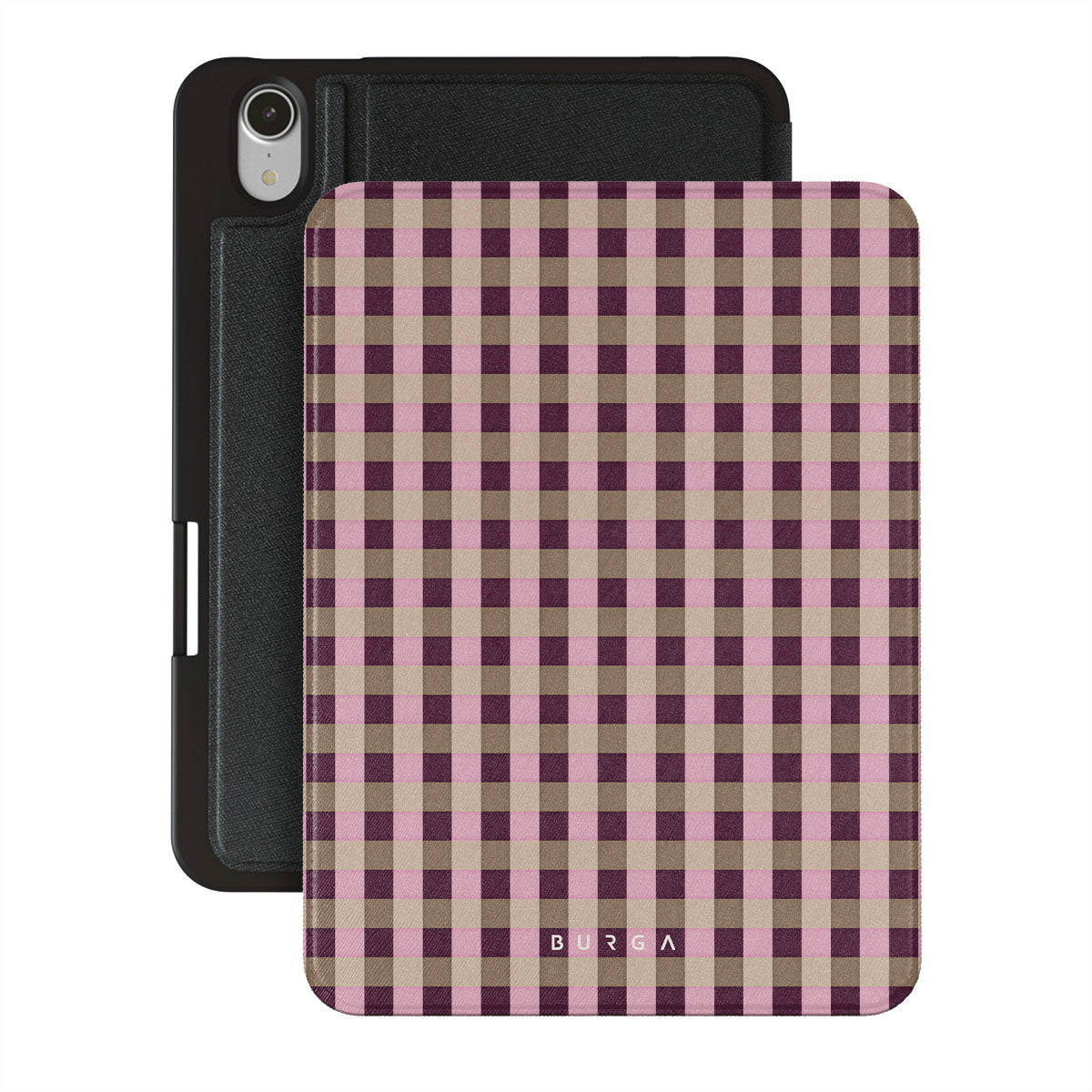 Główne elementy projektu: różowo-bordowy wzór w kratkę, nowoczesny styl.