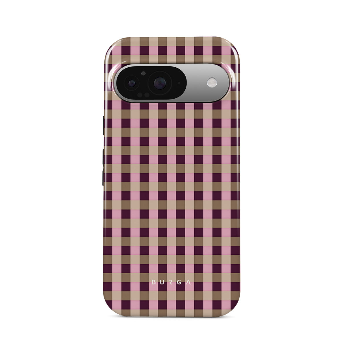 Główne elementy projektu: różowo-bordowy wzór w kratkę, nowoczesny styl.