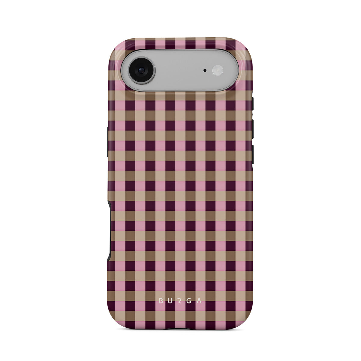 Główne elementy projektu: różowo-bordowy wzór w kratkę, nowoczesny styl.