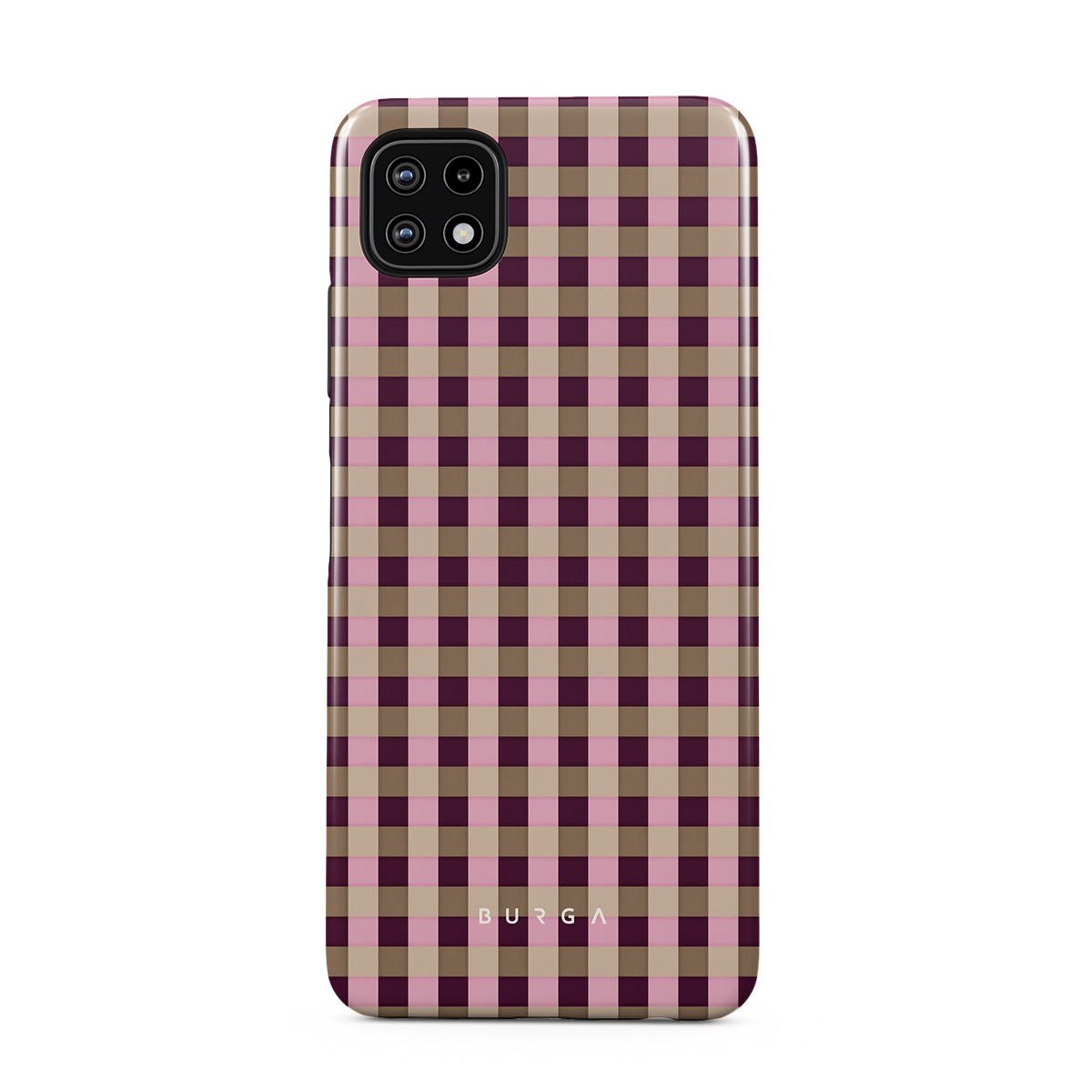 Główne elementy projektu: różowo-bordowy wzór w kratkę, nowoczesny styl.