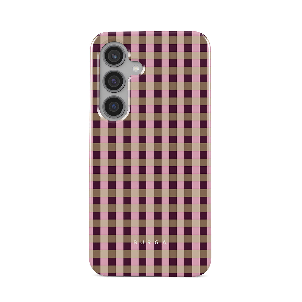 Główne elementy projektu: różowo-bordowy wzór w kratkę, nowoczesny styl.