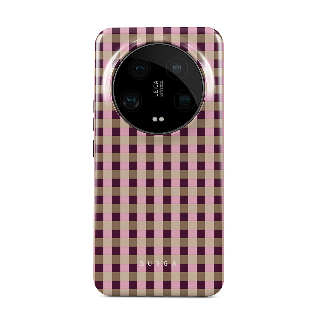 Główne elementy projektu: różowo-bordowy wzór w kratkę, nowoczesny styl.