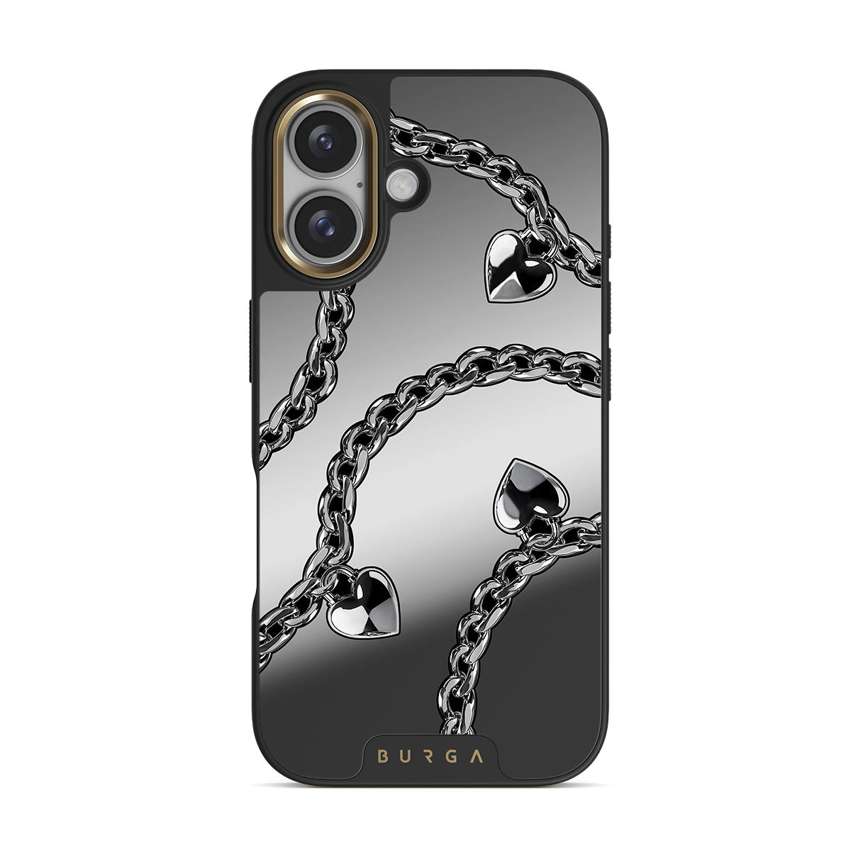 Główne elementy projektu: łańcuchy, serca, srebro, metaliczne detale, lustro