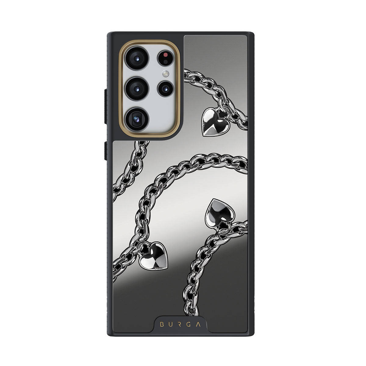 Główne elementy projektu: łańcuchy, serca, srebro, metaliczne detale, lustro
