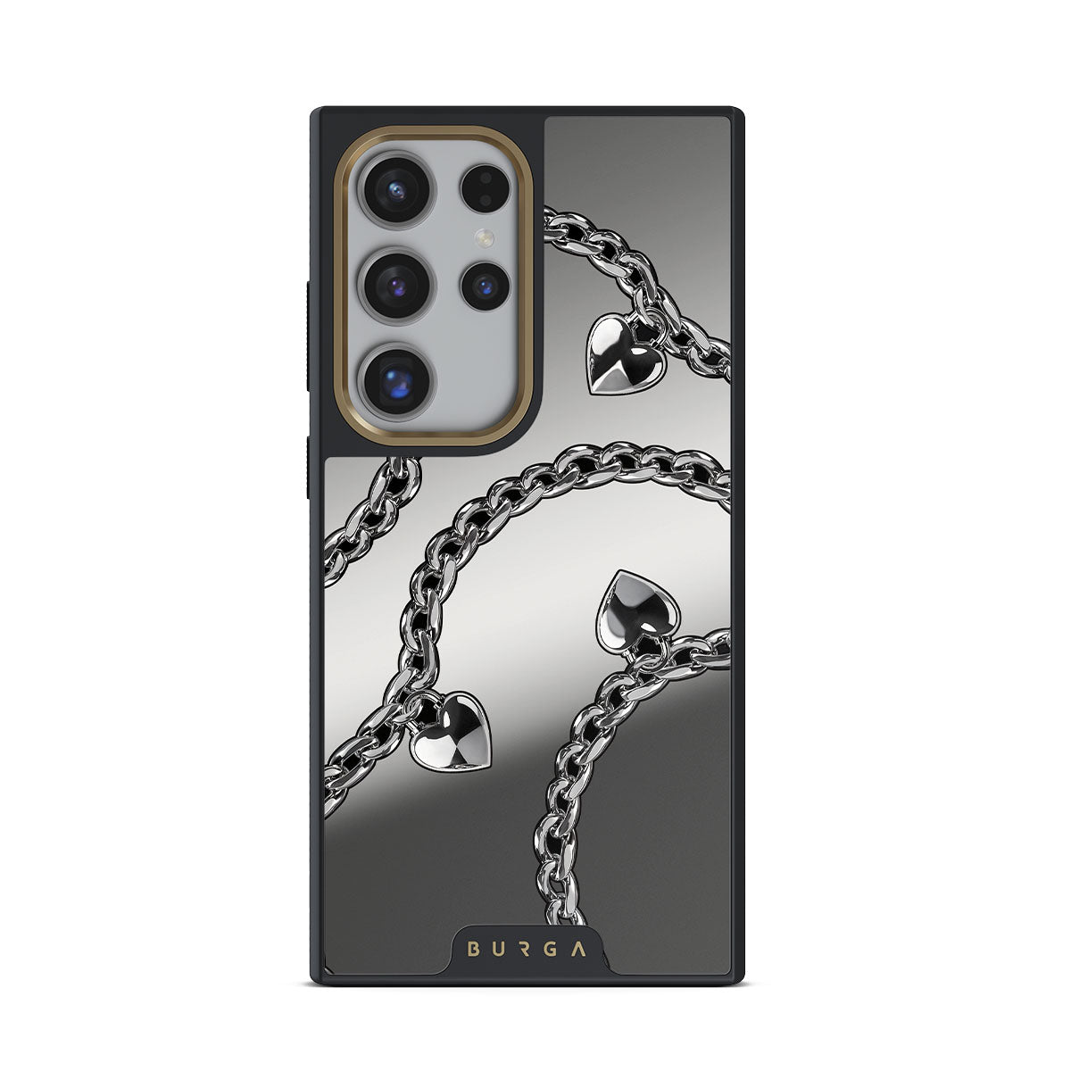 Główne elementy projektu: łańcuchy, serca, srebro, metaliczne detale, lustro