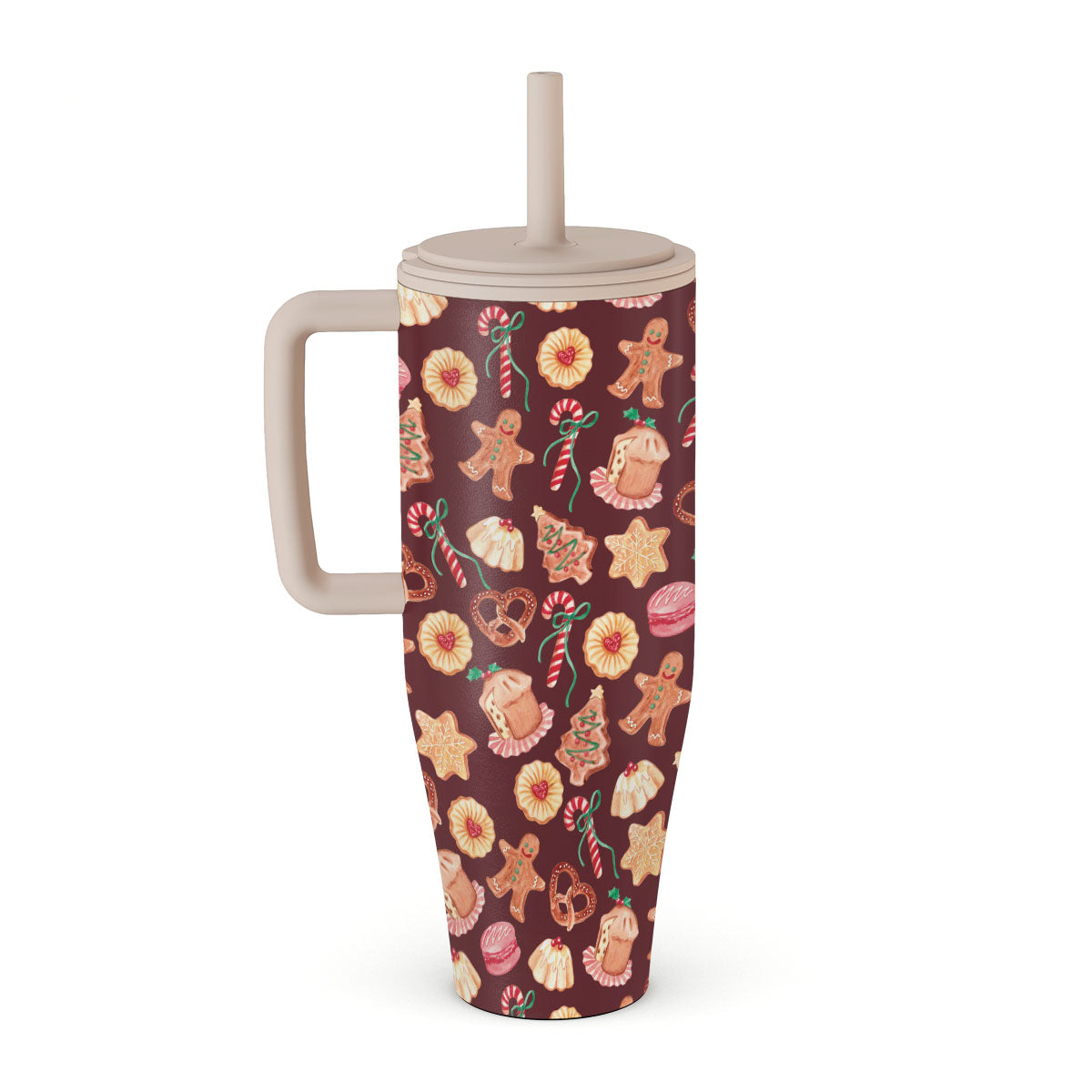 Główne elementy projektu: ciasteczka świąteczne, pierniczki, cukierki, cukierki miętowe, świąteczne słodycze, burgundowe tło