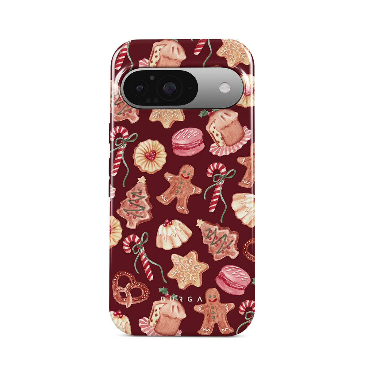 Główne elementy projektu: ciasteczka świąteczne, pierniczki, cukierki, cukierki miętowe, świąteczne słodycze, burgundowe tło