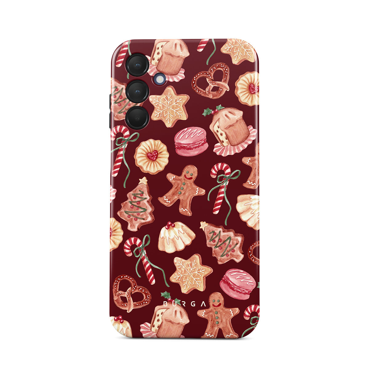 Główne elementy projektu: ciasteczka świąteczne, pierniczki, cukierki, cukierki miętowe, świąteczne słodycze, burgundowe tło