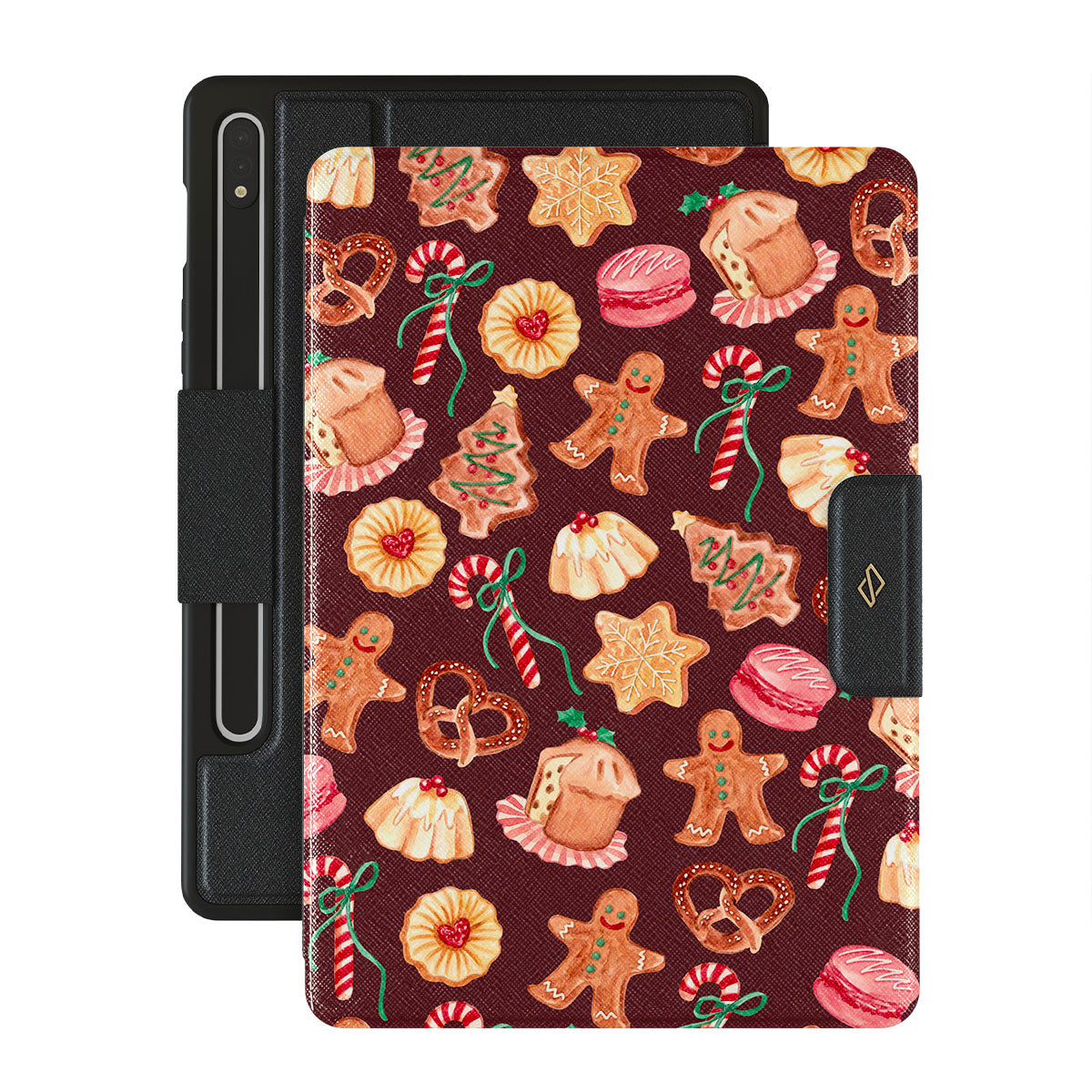 Główne elementy projektu: ciasteczka świąteczne, pierniczki, cukierki, cukierki miętowe, świąteczne słodycze, burgundowe tło