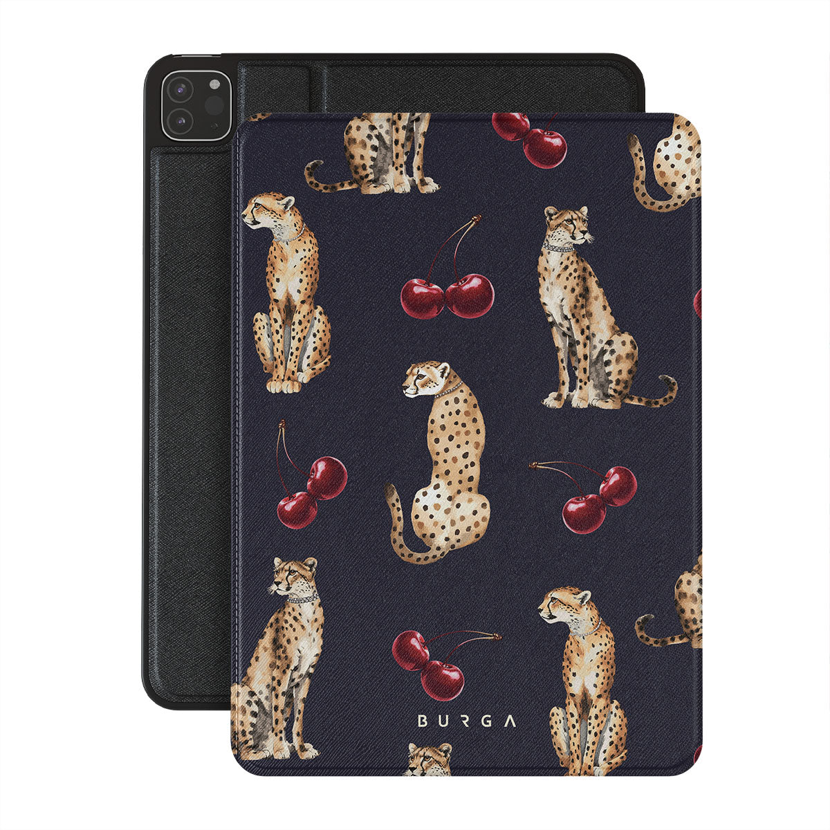 Główne elementy projektu: wzór w cętki, gepardy, wiśnie.
