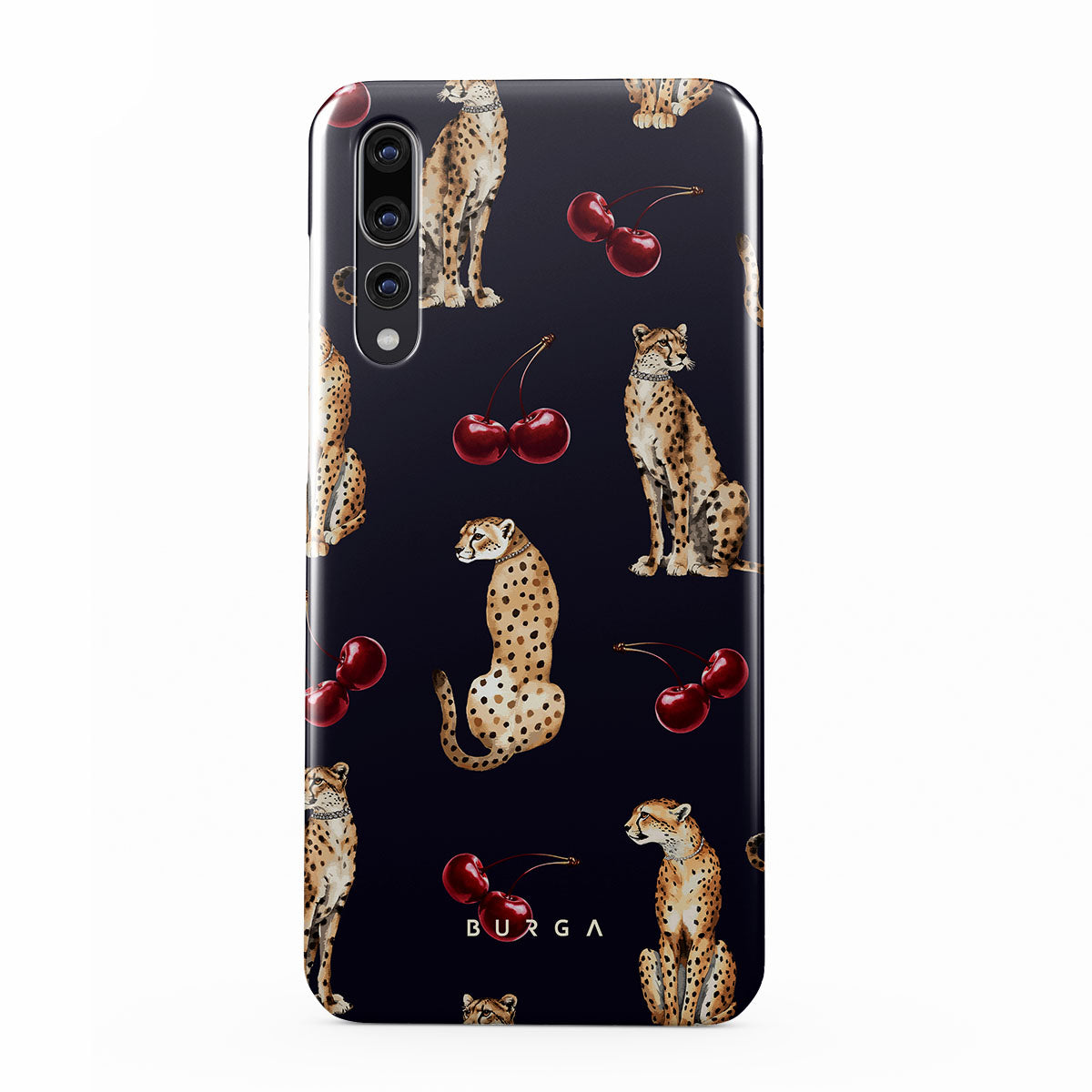 Główne elementy projektu: wzór w cętki, gepardy, wiśnie.