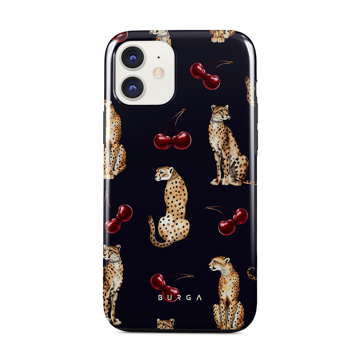 Główne elementy projektu: wzór w cętki, gepardy, wiśnie.