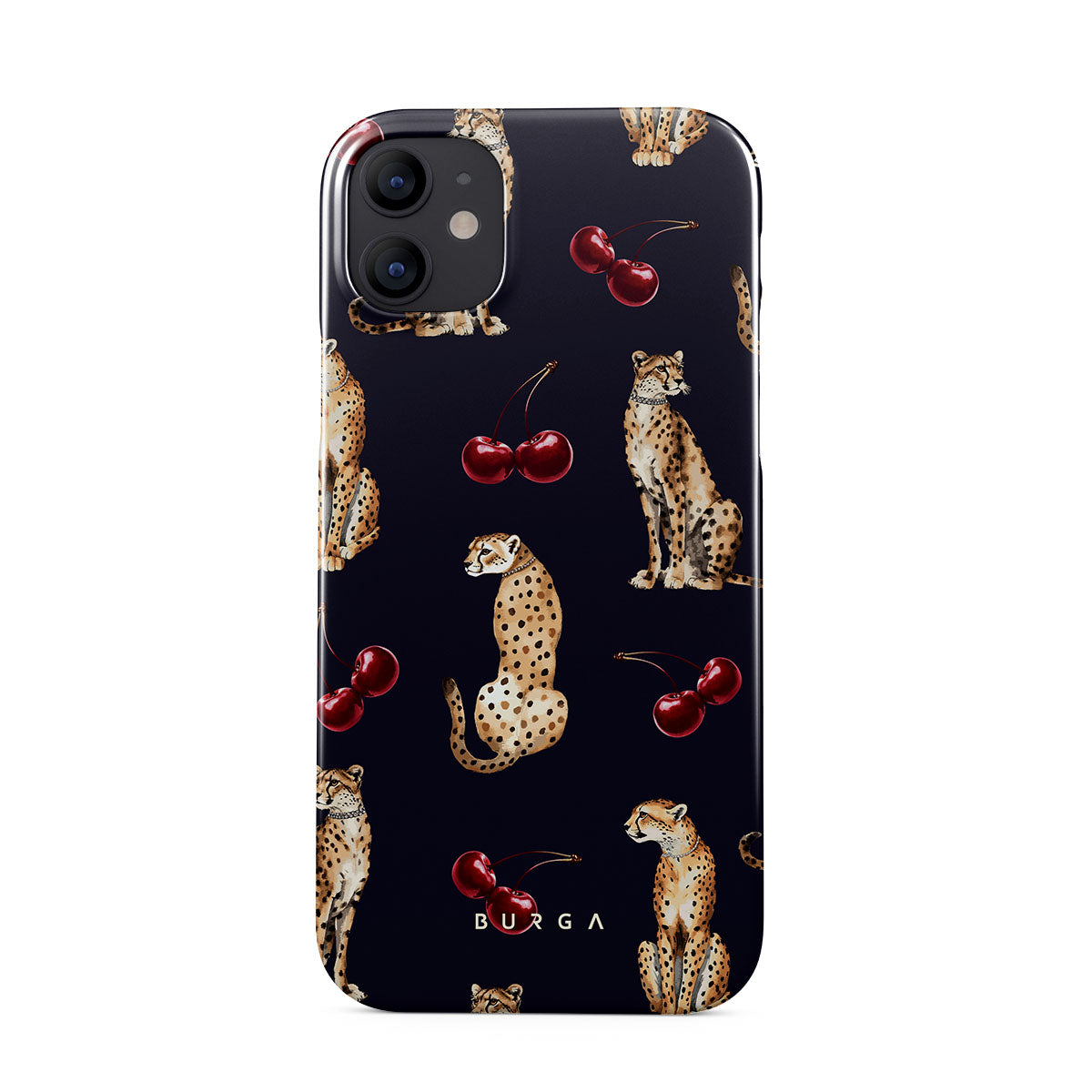 Główne elementy projektu: wzór w cętki, gepardy, wiśnie.