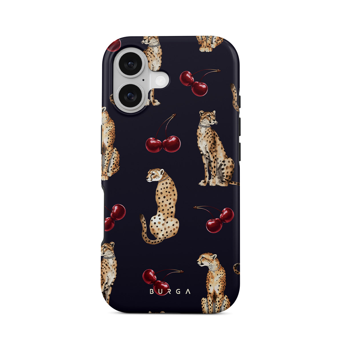 Główne elementy projektu: wzór w cętki, gepardy, wiśnie.