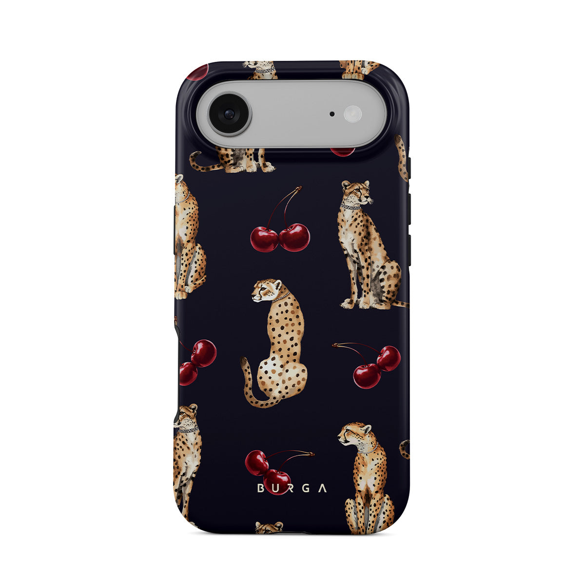 Główne elementy projektu: wzór w cętki, gepardy, wiśnie.
