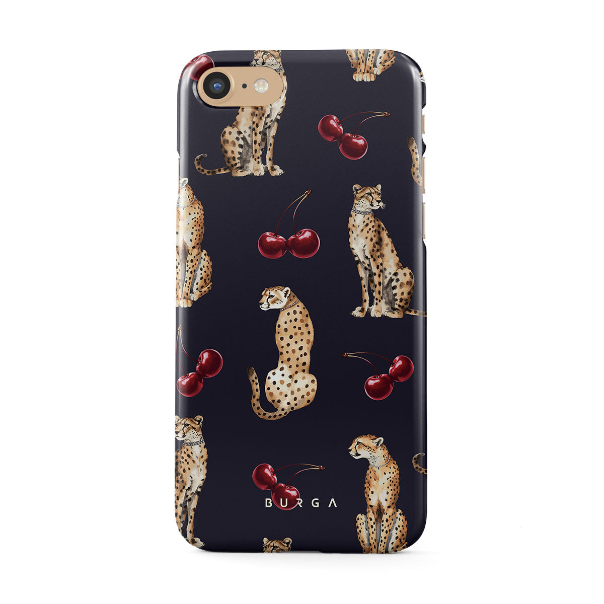 Główne elementy projektu: wzór w cętki, gepardy, wiśnie.