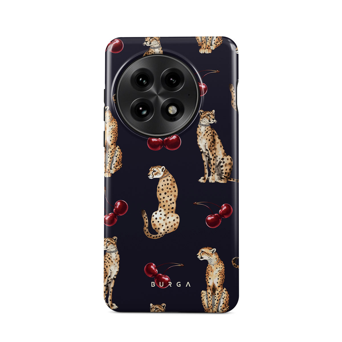 Główne elementy projektu: wzór w cętki, gepardy, wiśnie.