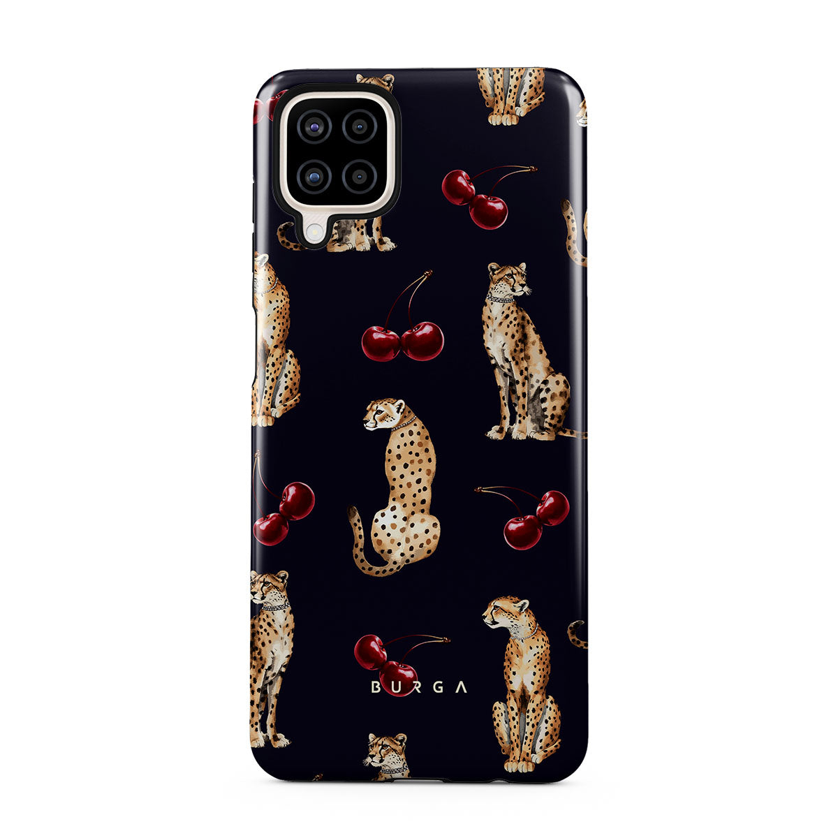 Główne elementy projektu: wzór w cętki, gepardy, wiśnie.