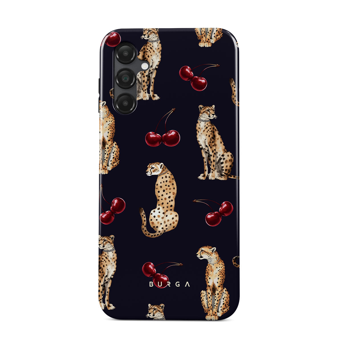 Główne elementy projektu: wzór w cętki, gepardy, wiśnie.