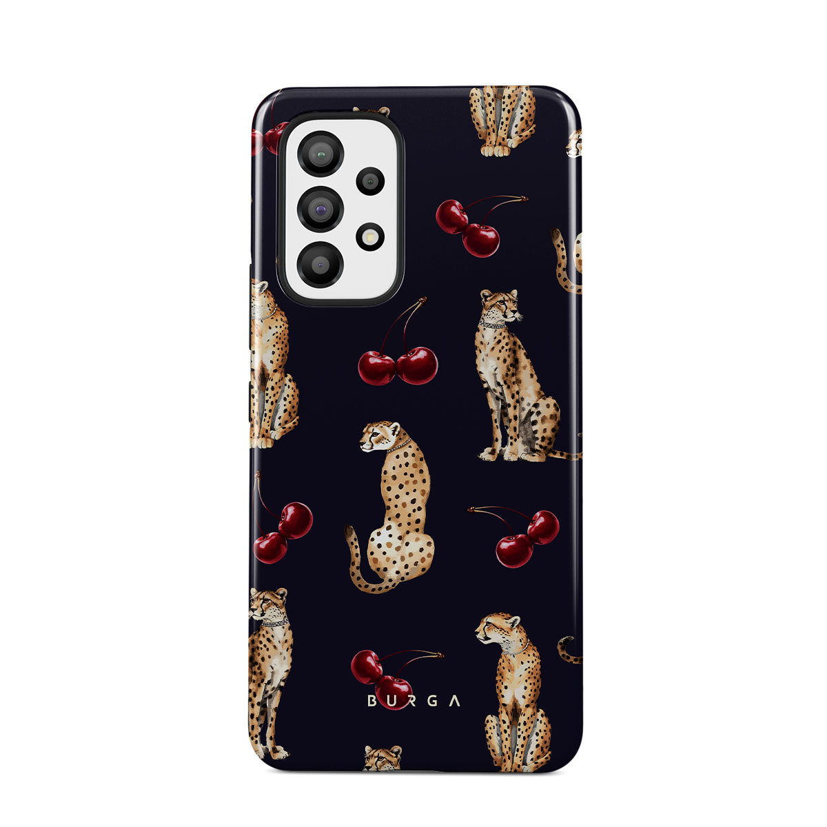 Główne elementy projektu: wzór w cętki, gepardy, wiśnie.