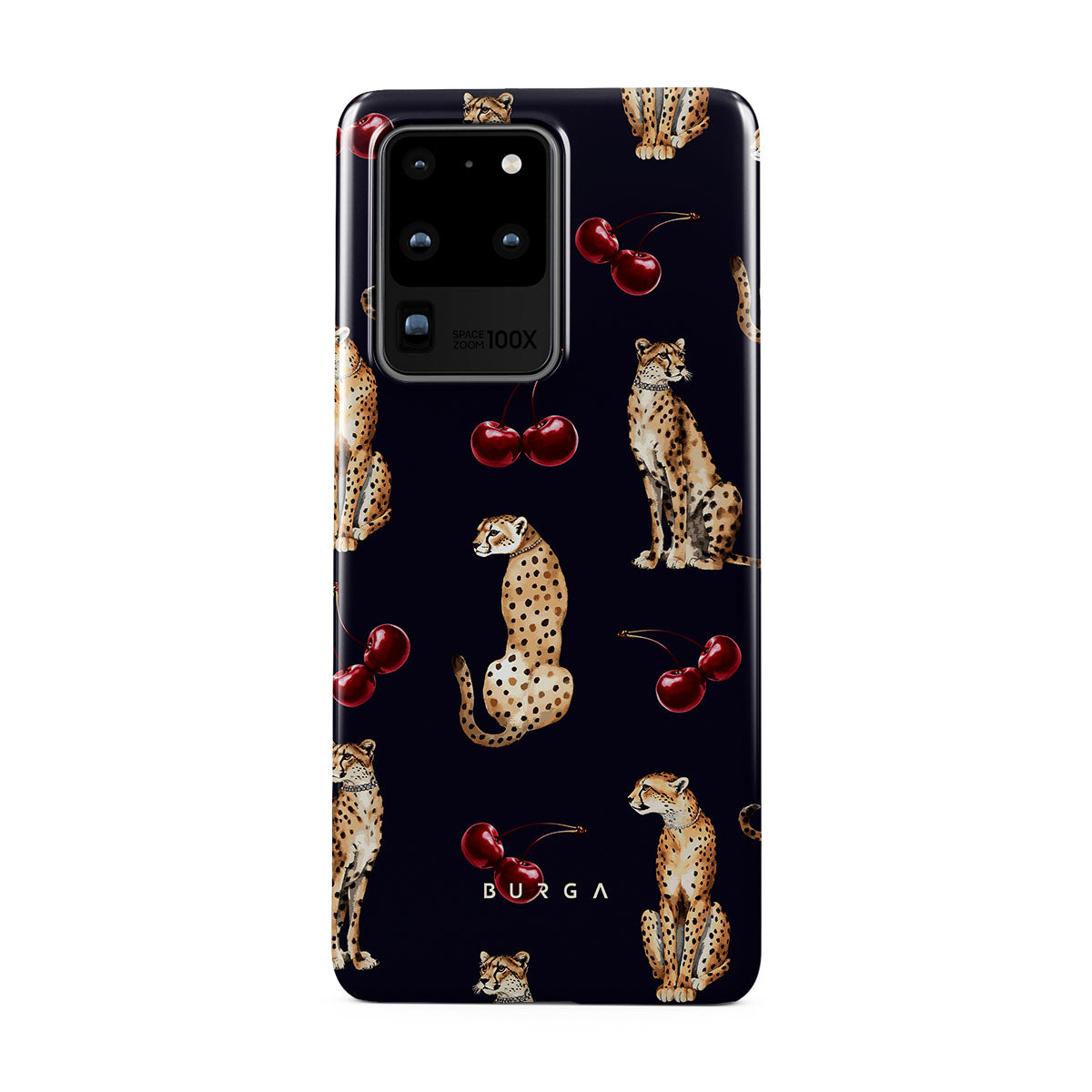 Główne elementy projektu: wzór w cętki, gepardy, wiśnie.