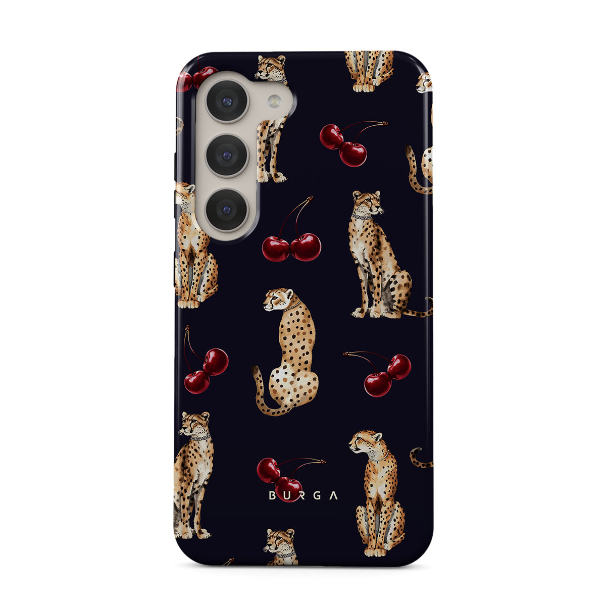 Główne elementy projektu: wzór w cętki, gepardy, wiśnie.