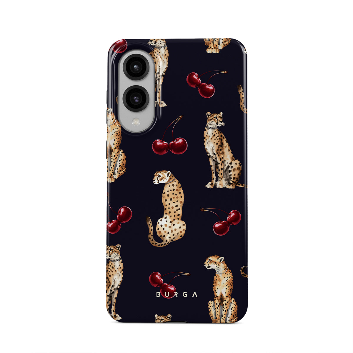Główne elementy projektu: wzór w cętki, gepardy, wiśnie.