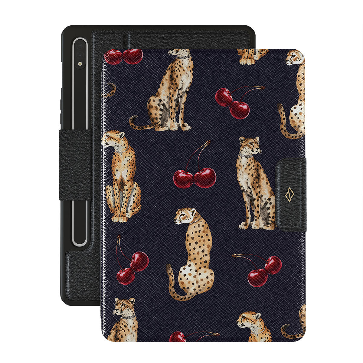 Główne elementy projektu: wzór w cętki, gepardy, wiśnie.