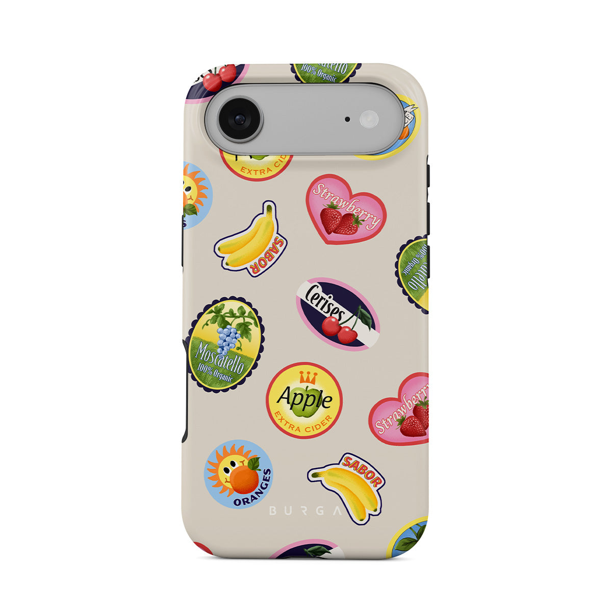 Główne elementy projektu: Banany, znaczki, wiśnie, jabłka, pomarańcze, truskawki, jaskrawe kolory, akcenty cytrusowe, motywy owocowe, tropikalne wzory.