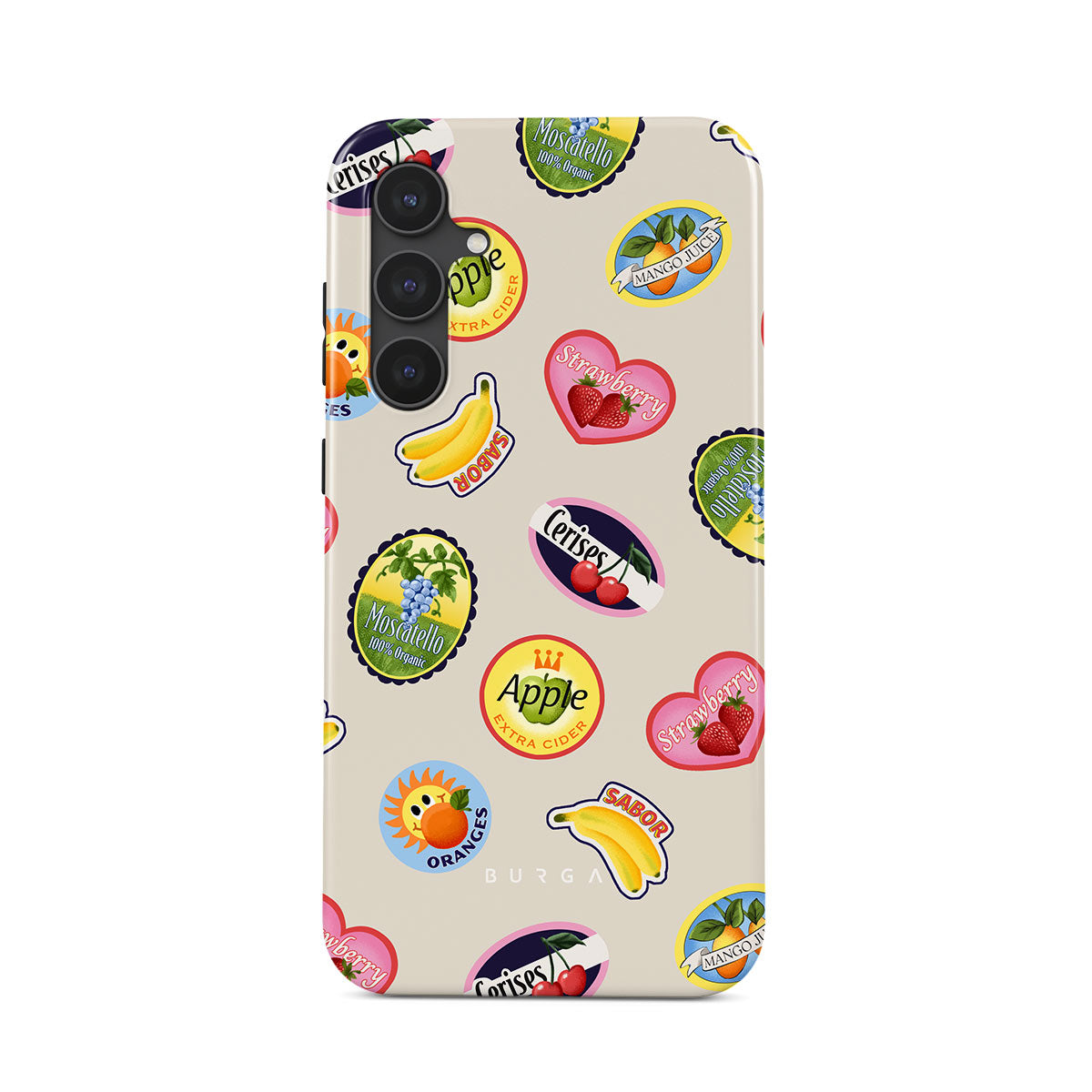Główne elementy projektu: Banany, znaczki, wiśnie, jabłka, pomarańcze, truskawki, jaskrawe kolory, akcenty cytrusowe, motywy owocowe, tropikalne wzory.